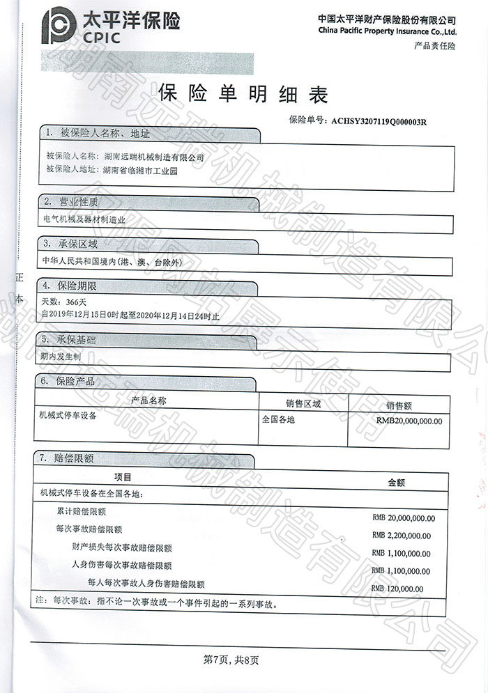 太平洋保险 产品责任保险证书